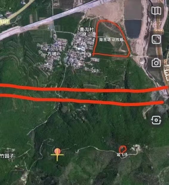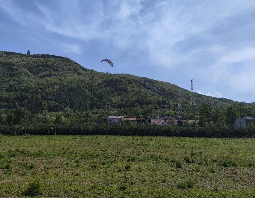 滑翔伞起飞场在山顶古塔处,降落场在山脚黄沟村旁。正在建设的电网将横穿滑翔伞飞行空域。