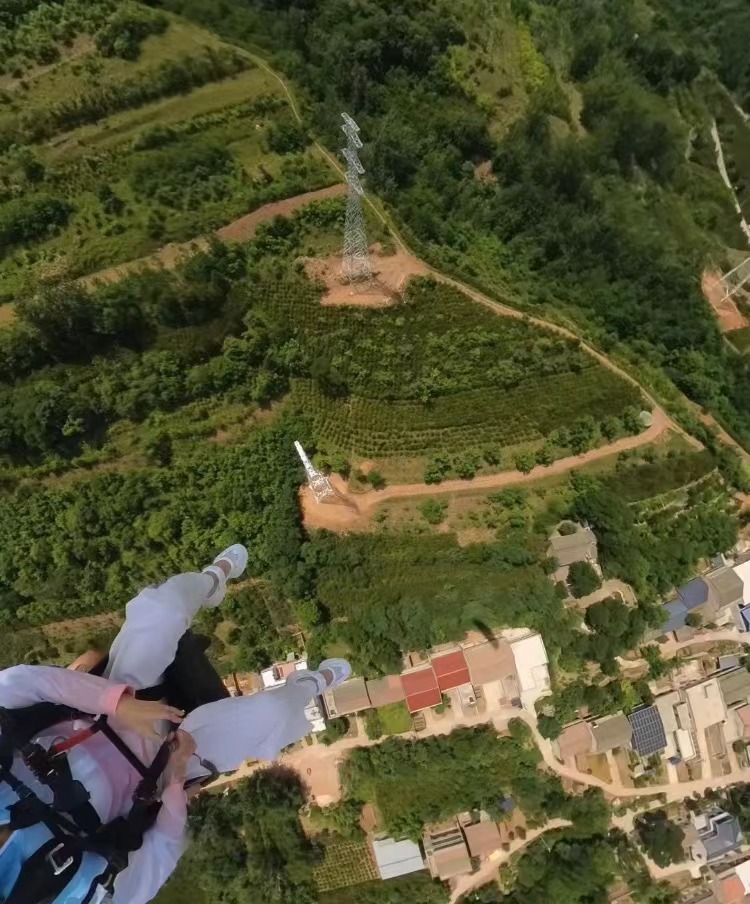 滑翔伞体验者从铁塔上空飞过。