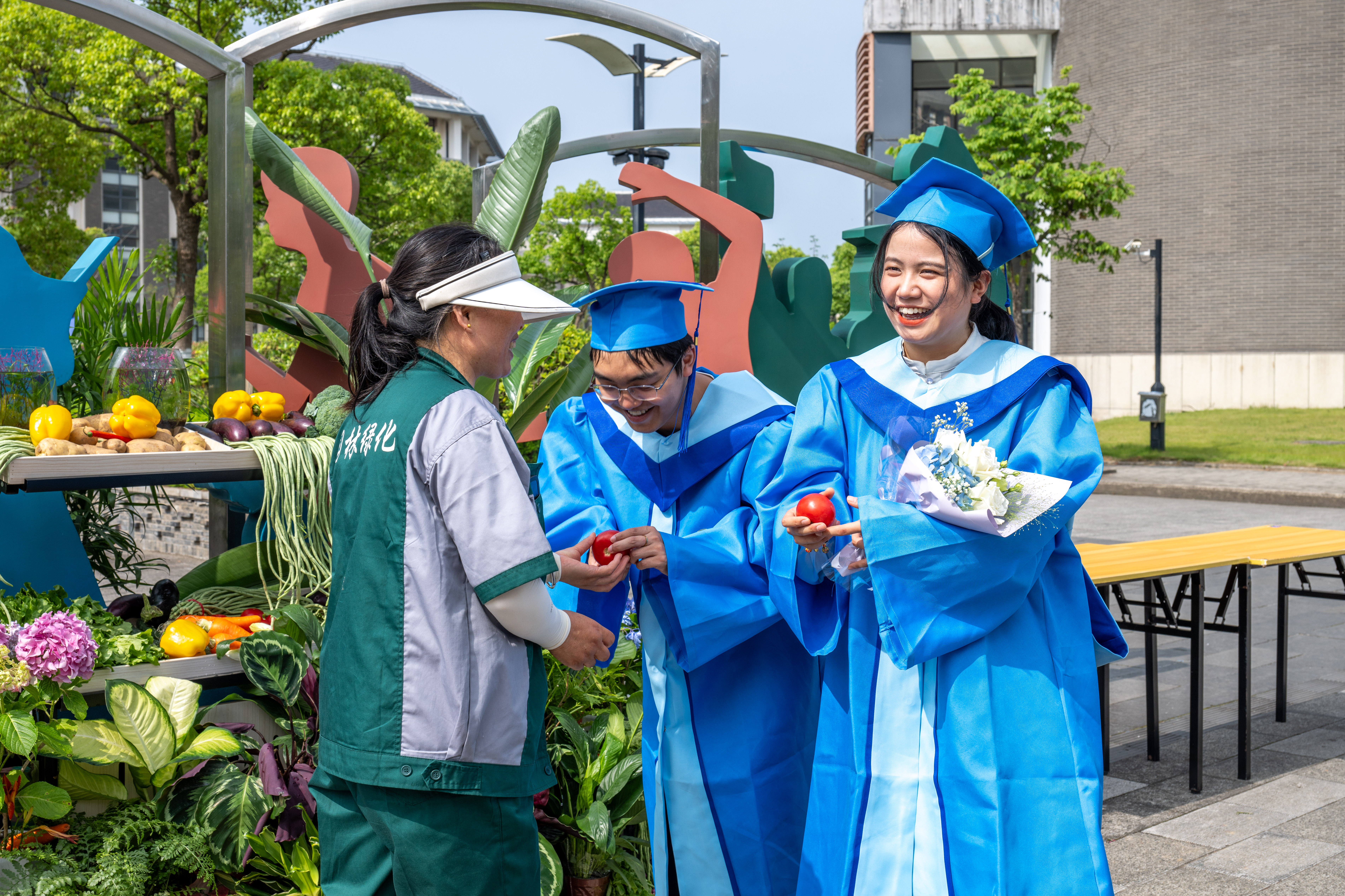 “长豆角寓意着长长久久,敦实的土豆寓意实实在在,生菜寓意才情满满......”叔叔阿姨们一边搭建蔬菜花墙,一边想着给同学们送出的毕业祝福。为了方便搭配色彩,他们还添上了些自己种下的蔬菜。蔬菜花墙上还放置了水族科学与技术专业同学的水族造景,充分彰显上海海洋大学的特色。拍照打卡后,叔叔阿姨们将这些蔬菜打包送给了毕业生。