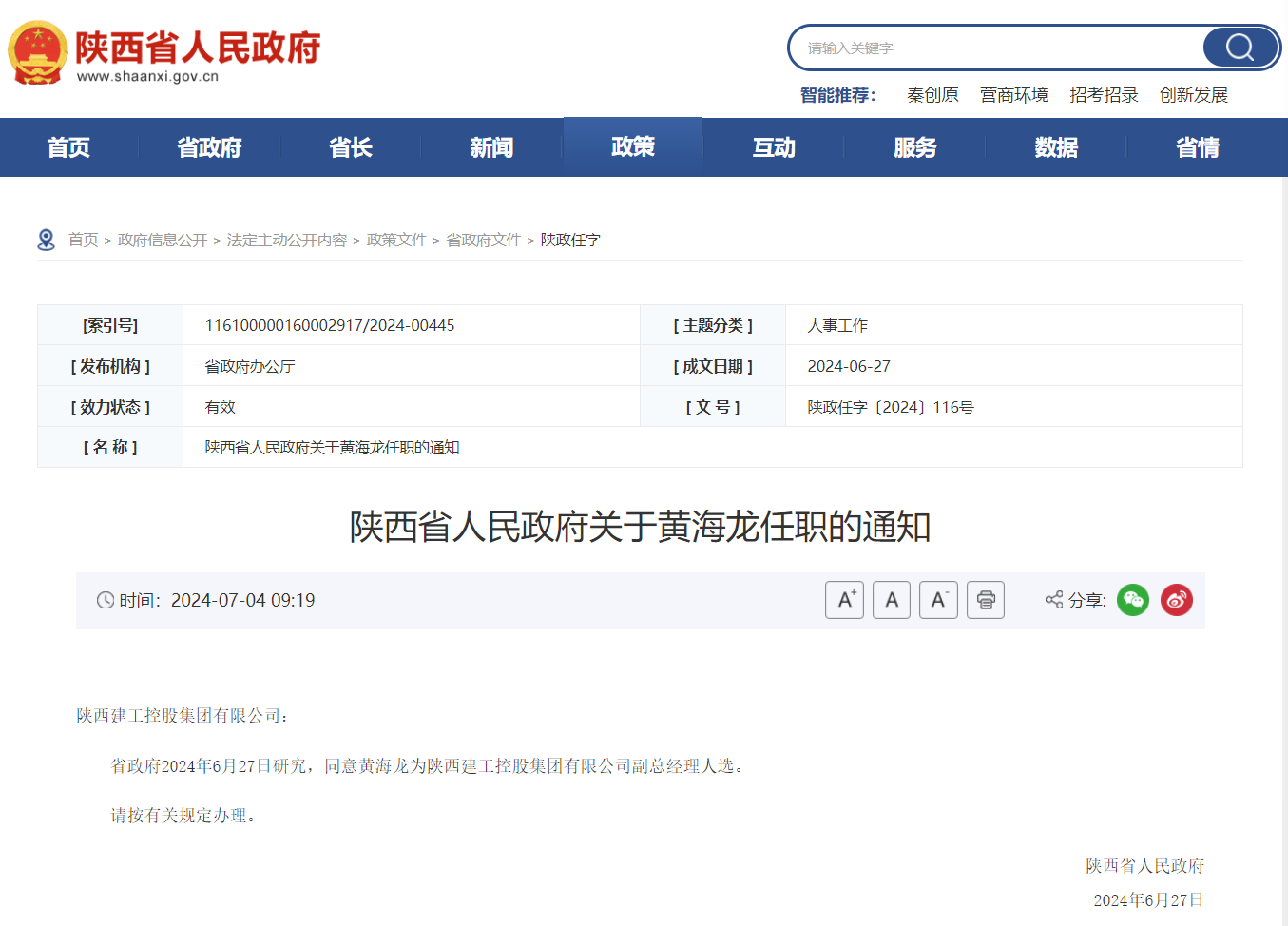 7月4日,陕西省政府官网发布任职通知:省政府6月27日研究,同意黄海龙为陕西建工控股集团有限公司副总经理人选。