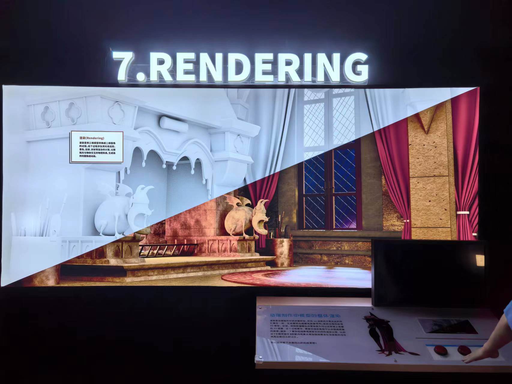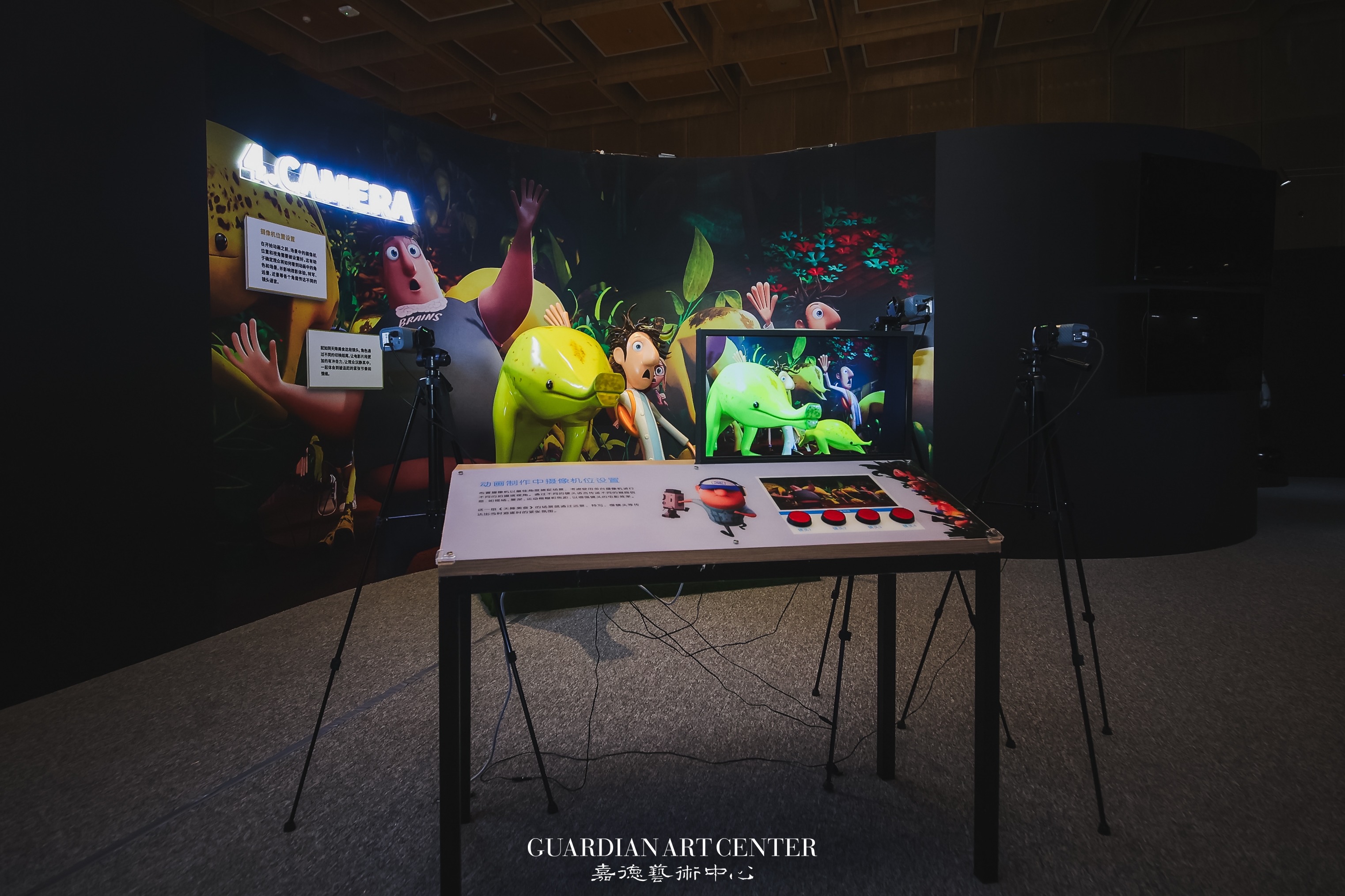 进入到拍摄环节,布置摄像机以最佳角度捕捉场景,考虑使用多台摄像机进行不同的拍摄或视角。通过不同的镜头语言传递不同的画面信息,如视场、景深、运动模糊和焦距,以增强镜头的电影效果。展览中还原《天降美食》的场景,通过远景、特写、慢镜头等传达出追逐时的紧张氛围。观众可以在互动环节切换各种镜头体验不同角度的差异。