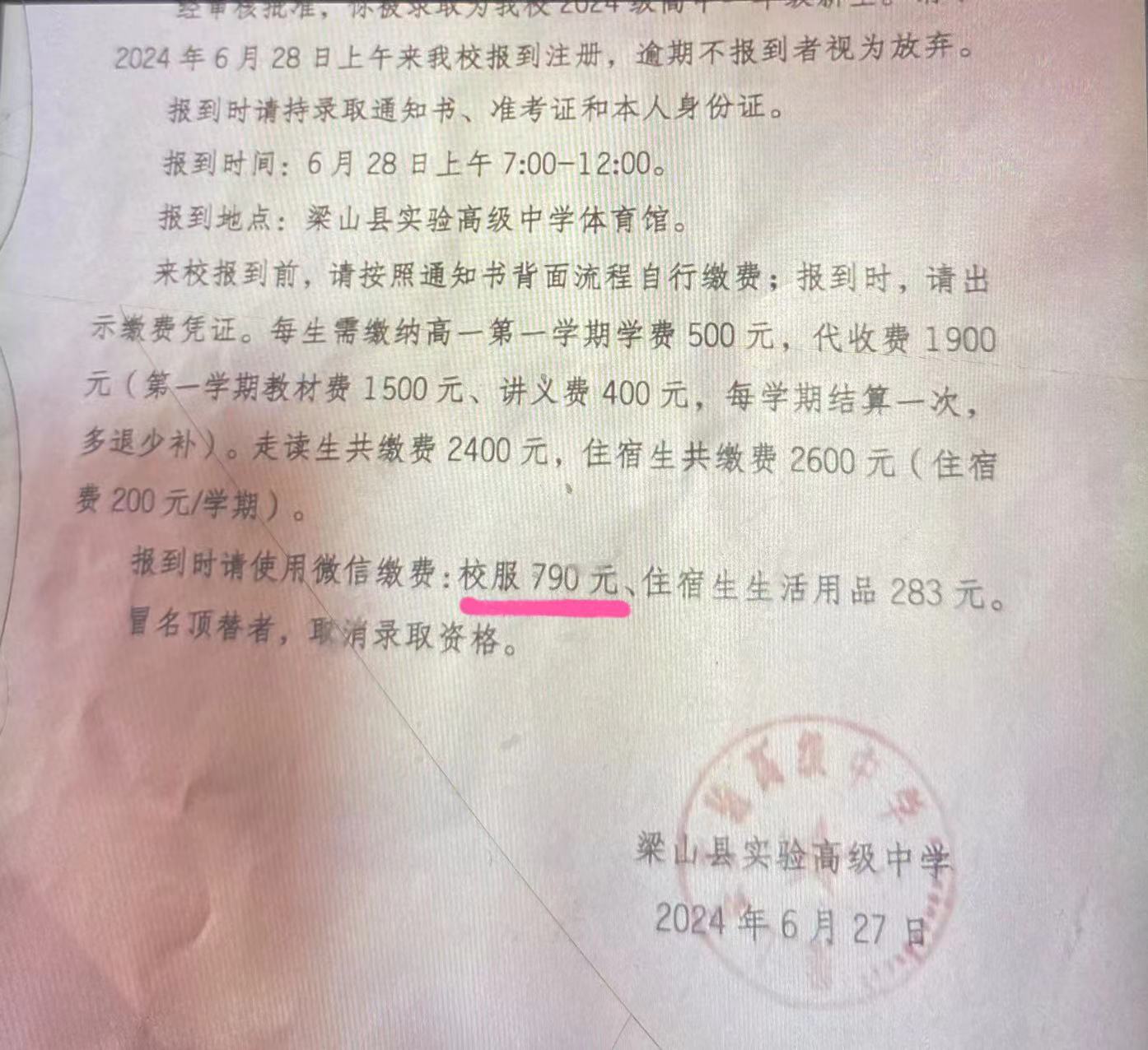 引发争议的790元校服费根据网上流传的录取报到通知书显示,学生前往梁山县高级实验中学报到时,每生需缴纳高一第一学期学费500元,代收费1900元,走读生需缴费2400元,住宿生需缴费2600元。另外,报到时需要用微信缴790元的校服费,住宿生生活用品费283元。