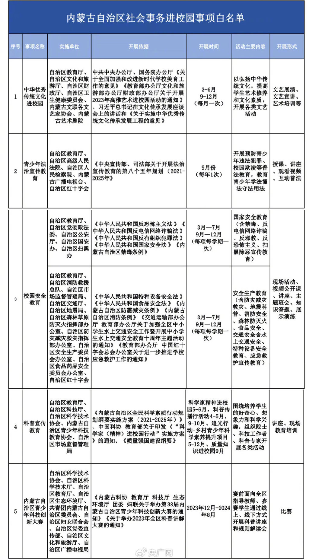 《内蒙古自治区社会事务进校园白名单》近日公布,未列入“白名单”管理的事项,一律不得进入校园发布相关通知的同时,江西南昌、抚州等地还公布了教育行政部门举报电话和电子邮箱,广泛征集社会事务进校园加重教师负担有关问题线索,受理相关举报投诉。