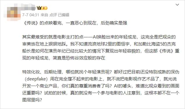 原标题:《成龙的新电影《传说》扑街了,因为他们的AI换脸实在太抽象了。》