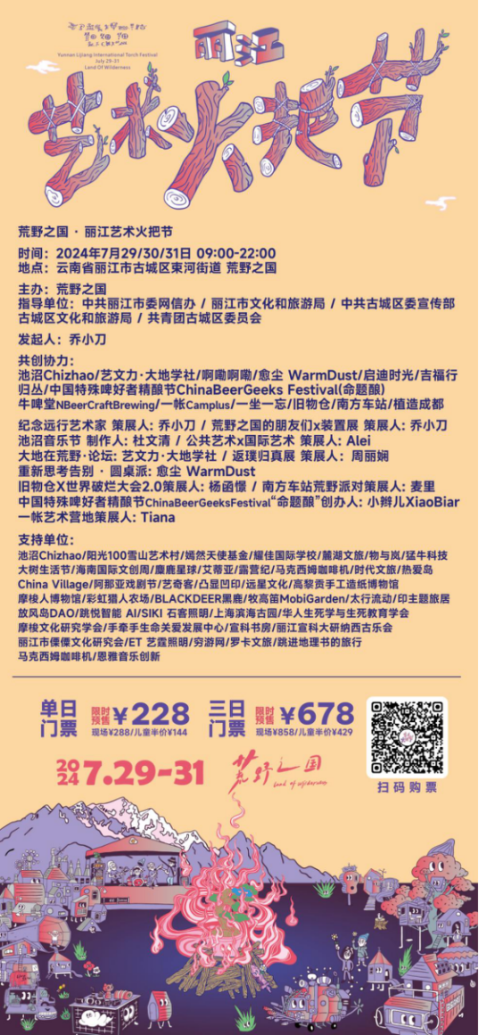 7月18日,2024年丽江艺术火把节新闻媒体推介会宣布,7月29日至31日每天9:00—22:00,“荒野之国”将举办艺术火把节活动。