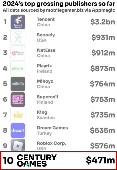世纪华通旗下点点互动挺进全球手游发行商营收TOP10