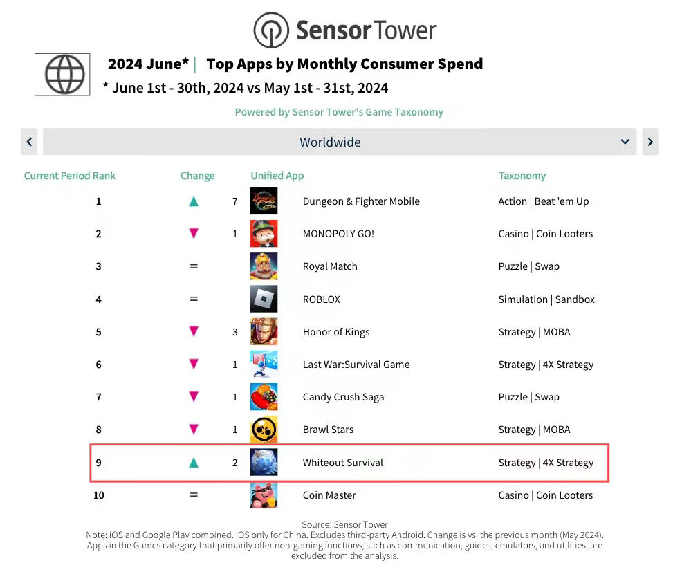 《无尽冬日》位列Sensor Tower6月全球手游收入榜第九名