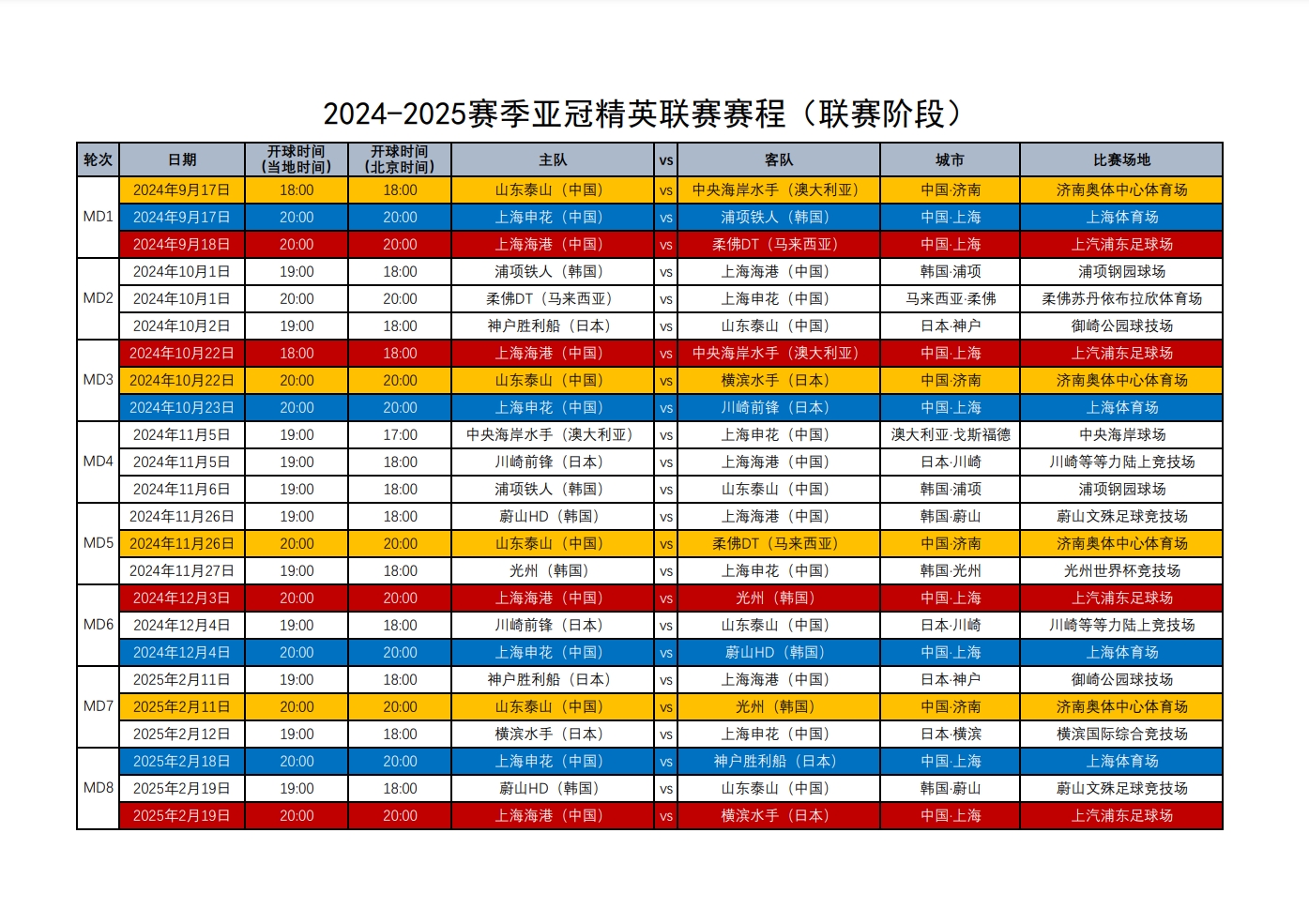 1.2024-2025赛季亚冠精英联赛赛程(联赛阶段)