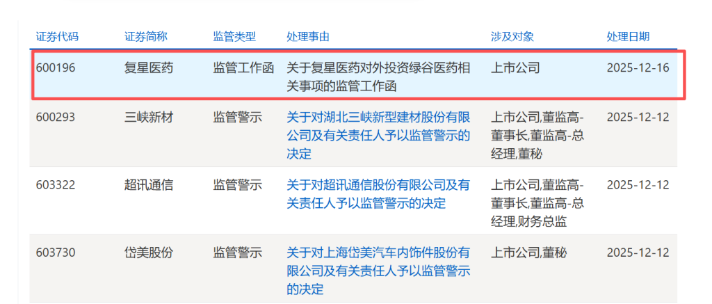12月16日,上海证券交易所官网显示,上交所对复星医药下发监管工作函,处理事由是关于复星医药对外投资绿谷医药相关事项,涉及对象是上市公司。此次监管工作函的具体内容并未披露。