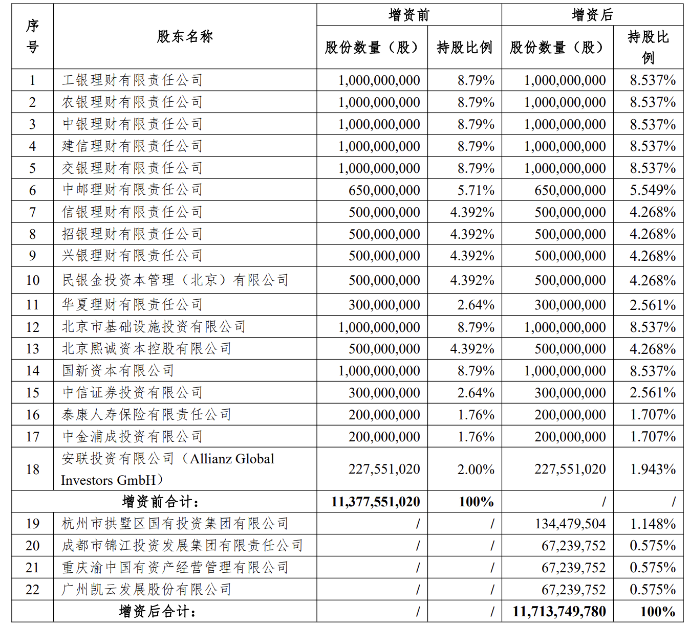 国民养老保险今日发布的公告显示,其本次新发行的股份全部由4家新增股东认购,其中拱墅国投拟出资2亿元,拟认购约1.34亿股股份,增资后持股比例是1.148%;锦江发展集团、渝中国资、凯云发展拟分别出资1亿元,拟分别认购约0.67亿股股份,增资完成后,3家股东的持股比例均为0.575%。