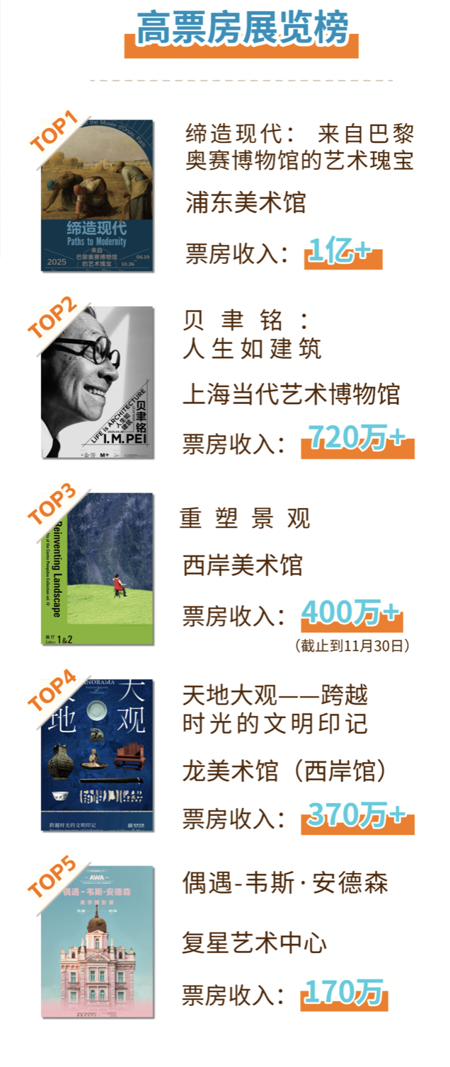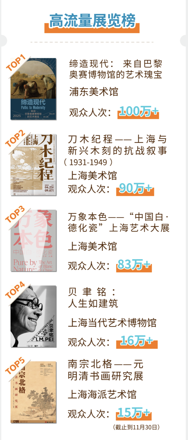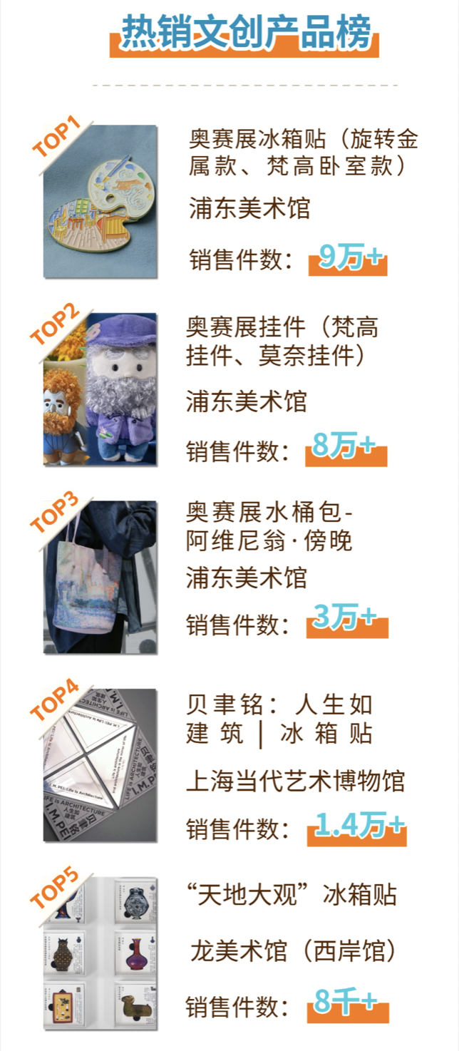 其中,浦东美术馆的“缔造现代:来自巴黎奥赛博物馆的艺术瑰宝”、上海美术馆“刀木纪程——上海与新兴木刻的抗战叙事”、“万象本色——‘中国白·德化瓷’上海艺术大展”分别位居“高流量展览”榜前三;浦东美术馆的“缔造现代:来自巴黎奥赛博物馆的艺术瑰宝”、上海当代艺术博物馆“贝聿铭:人生如建筑”、西岸美术馆“重塑景观”分别位居“高票房展览”榜前三;“奥赛展”数款文创位居热销文创产品榜。