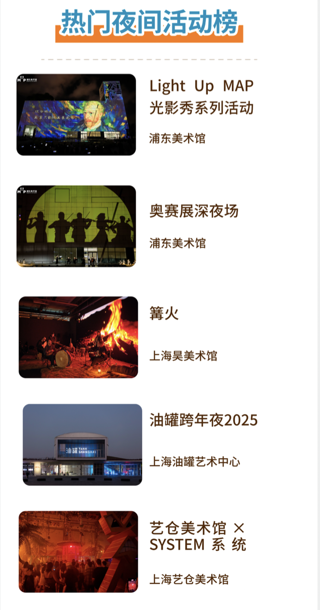 今年,上海市文化和旅游局着手开展提升美术馆促消费能力的探索,一份《2025年上海美术馆消费力促进榜单》在主题日上揭晓。基于详实的数据和案例分析,“高流量展览”“高票房展览”“热销文创产品”“跨界合作项目”和“热门夜间活动”五个维度的热榜汇集了一批在激发市场活力方面表现卓越的美术馆项目。