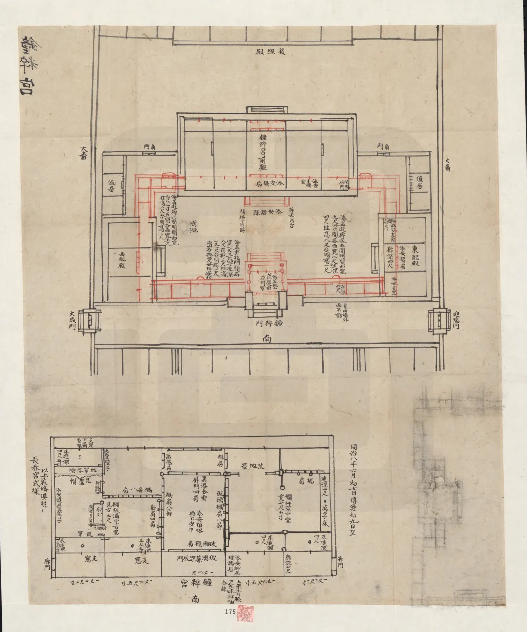 同治皇帝成人后慈安决定回到钟粹中居住,于是对钟粹宫建筑进行改造。国家图书馆藏样式雷图纸YSL175-0007“同治八年六月初七日传烫初九日交”、YSL175-0003和YSL290-0009反映了钟粹宫院落和正殿内檐装修的修改状况。(图7)