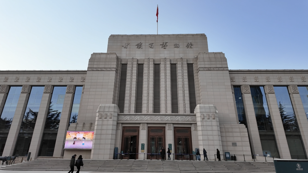 在兰州市中心,一座古典建筑尽显庄重典雅,这便是甘肃省博物馆,建筑不高,呈“山”字形对称分布。在车水马龙的西津西路上,一侧是收藏从远古时期到近现代珍贵文化遗存的历史殿堂,另一侧正上演兰州最繁华闹市的都市烟火。