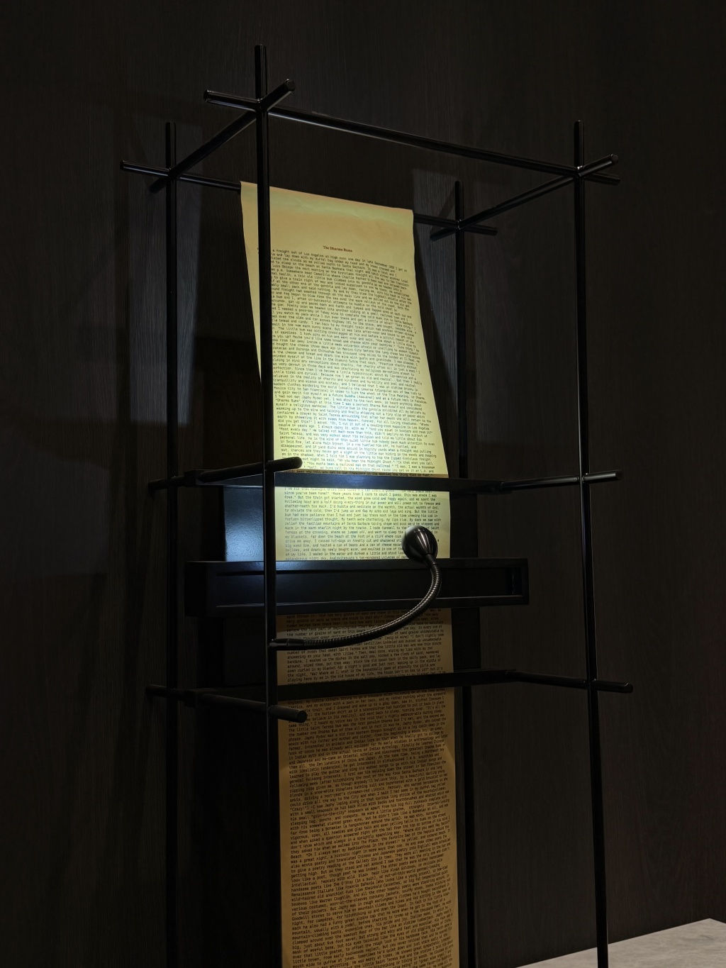 以凯鲁亚克于1957年创作的《达摩流浪者》打字稿长卷为灵感的装置作品是该单元的亮点之一。当年,凯鲁亚克将十页打字纸以胶带衔接,组成一卷长达18.6米的打字稿,以避免因换纸或分页而打断创作节奏。这种卷轴式写作保留了语言的流动性与即兴性,体现他所信奉的佛教理念——“第一念即最善念”,并成为“垮掉的一代”自由书写精神的重要象征。