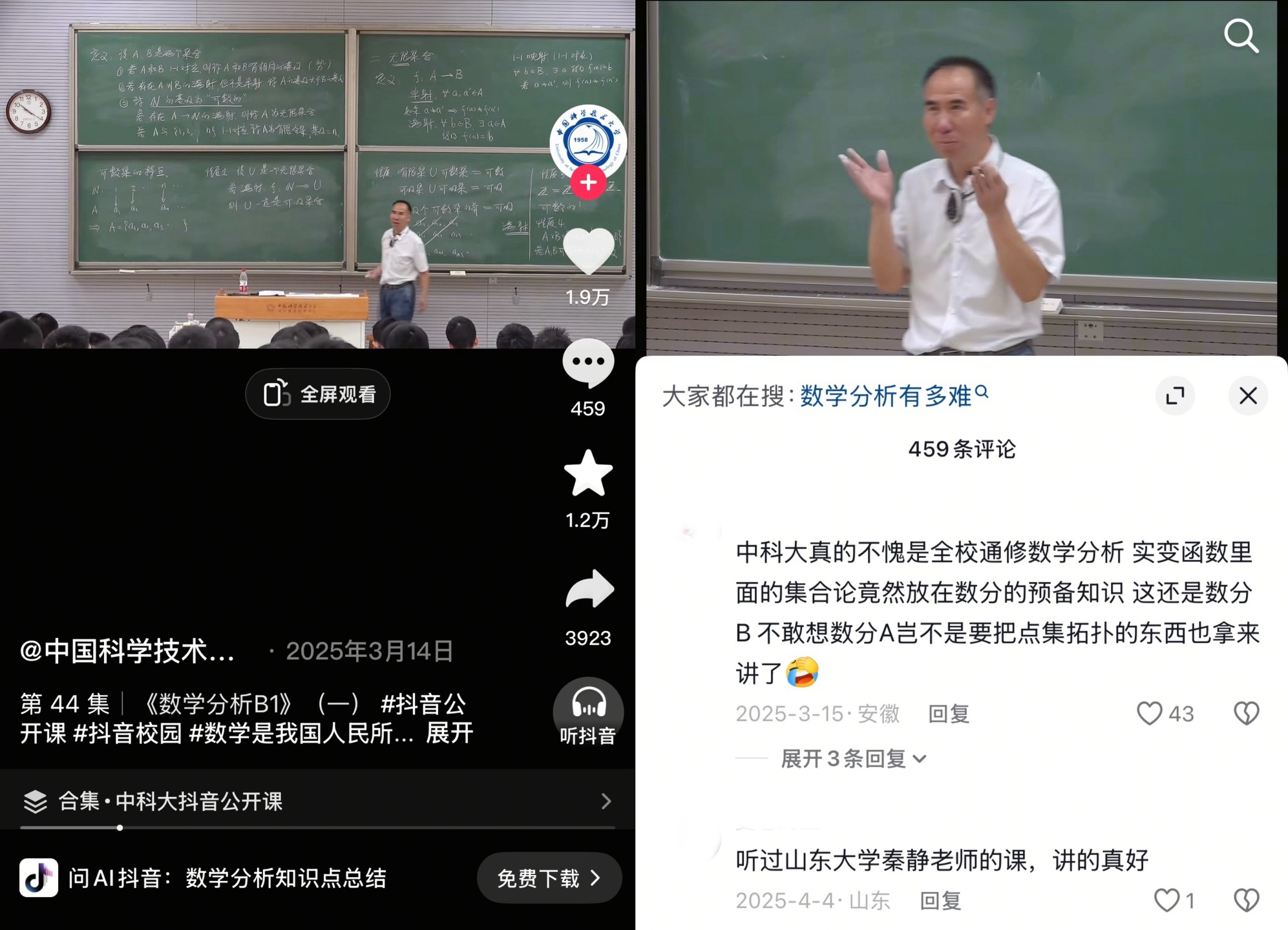 2月初,《抖音精选公开课数据报告》发布,报告显示,抖音精选公开课自2025年8月上线以来,该项目已与100多所高校达成合作,引入超700门高校公开课视频,吸引了超1.45亿用户观看7.6亿次,其中完整看完一门课的用户数超过175万。《普通物理》《钱的流转》《书法》等成为完播人数最高的高校公开课。