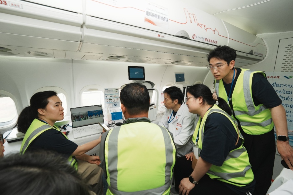 这架配备先进眼科手术显微镜、耳鼻喉内窥镜系统、数字化诊疗设备的飞机,在万象瓦岱国际机场与玛霍索综合医院之间搭建起空中五官健康桥梁。中国医护团队在义诊筛查出的疑难病例被转入飞机医院进行深度检查、MDT会诊或手术,在飞机医院百级层流洁净手术舱,复旦大学附属眼耳鼻喉科医院院长周行涛带领团队完成首批海外眼科手术,同时飞机上搭载的高端设备也用于当地医院联合门诊。