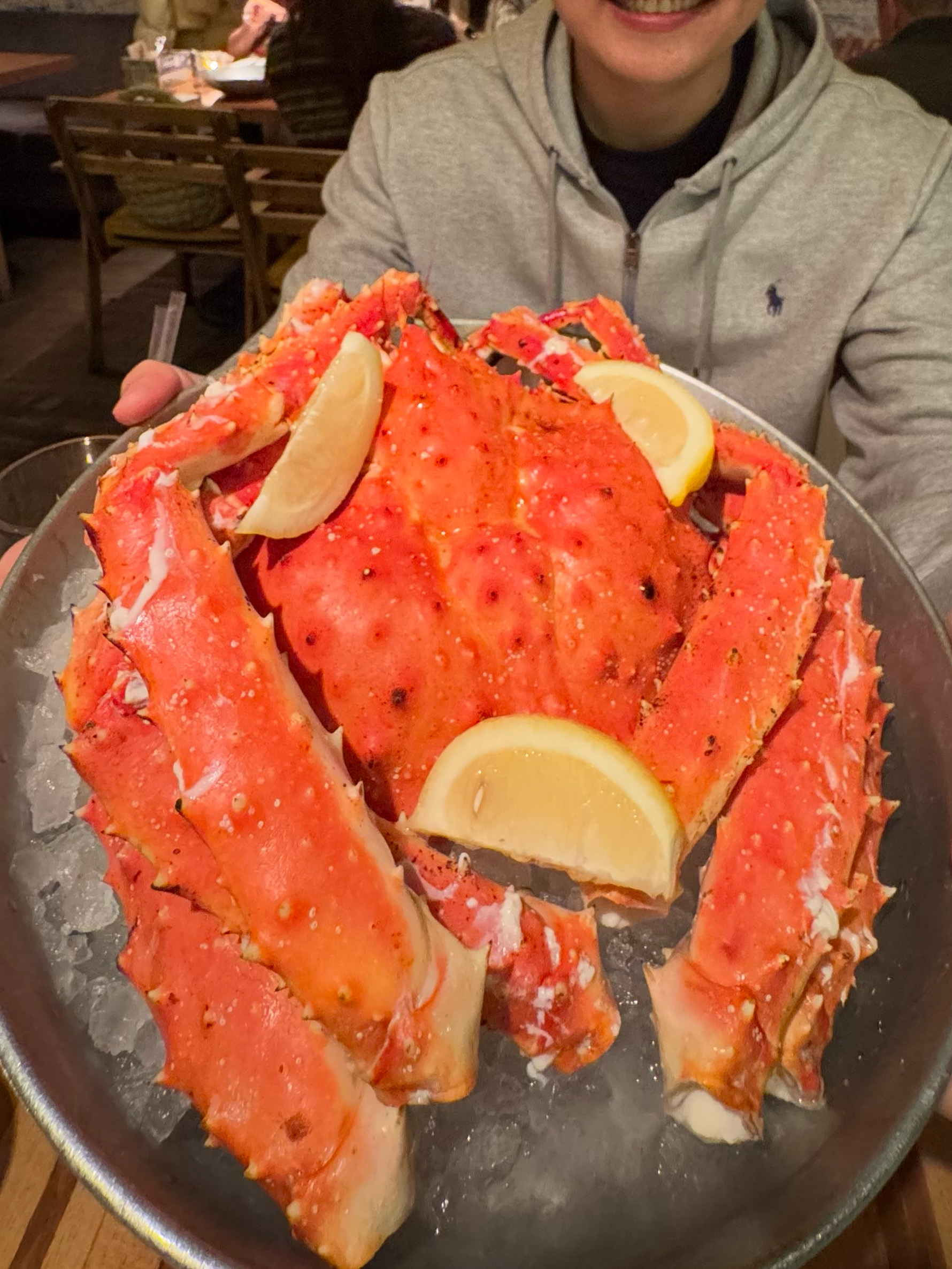 说到俄罗斯美食,虽然也算“白人饭”,但比常见的白人饭好吃不少。可能是因为海参崴离我国东北地区比较近,饮食上多了些融合感,味道总体很适口,俄罗斯人还是挺会吃的,当地很受欢迎的格鲁吉亚菜,特地去尝了一家,味道确实不错,有点像咱们新疆和西北菜融合,但更精致一些。除此之外,还有大名鼎鼎的各种帝王蟹餐厅,据说这里的帝王蟹比国内便宜,还更新鲜,9-12月正是捕捞季,那时刷到的自媒体标题清一色“年轻人涌向海参崴吃帝王蟹”的景象,就像“到海参崴不吃帝王蟹,等于白来。”的宣传语一样,成了必打卡之一,不过一整只新鲜帝王蟹也不算便宜,要五六百人民币,胜在新鲜,但来都来了,勒紧裤带也要吃上一次。我是第一次吃帝王蟹,它的肉质清甜,视觉上很有食欲,拍照也很出片,只是味道没到惊艳的程度。因为游客到了都想尝鲜,很多帝王蟹餐厅都一座难求,我连着去了几家都没位置,直到最后一天才吃上,也算是圆了心愿。