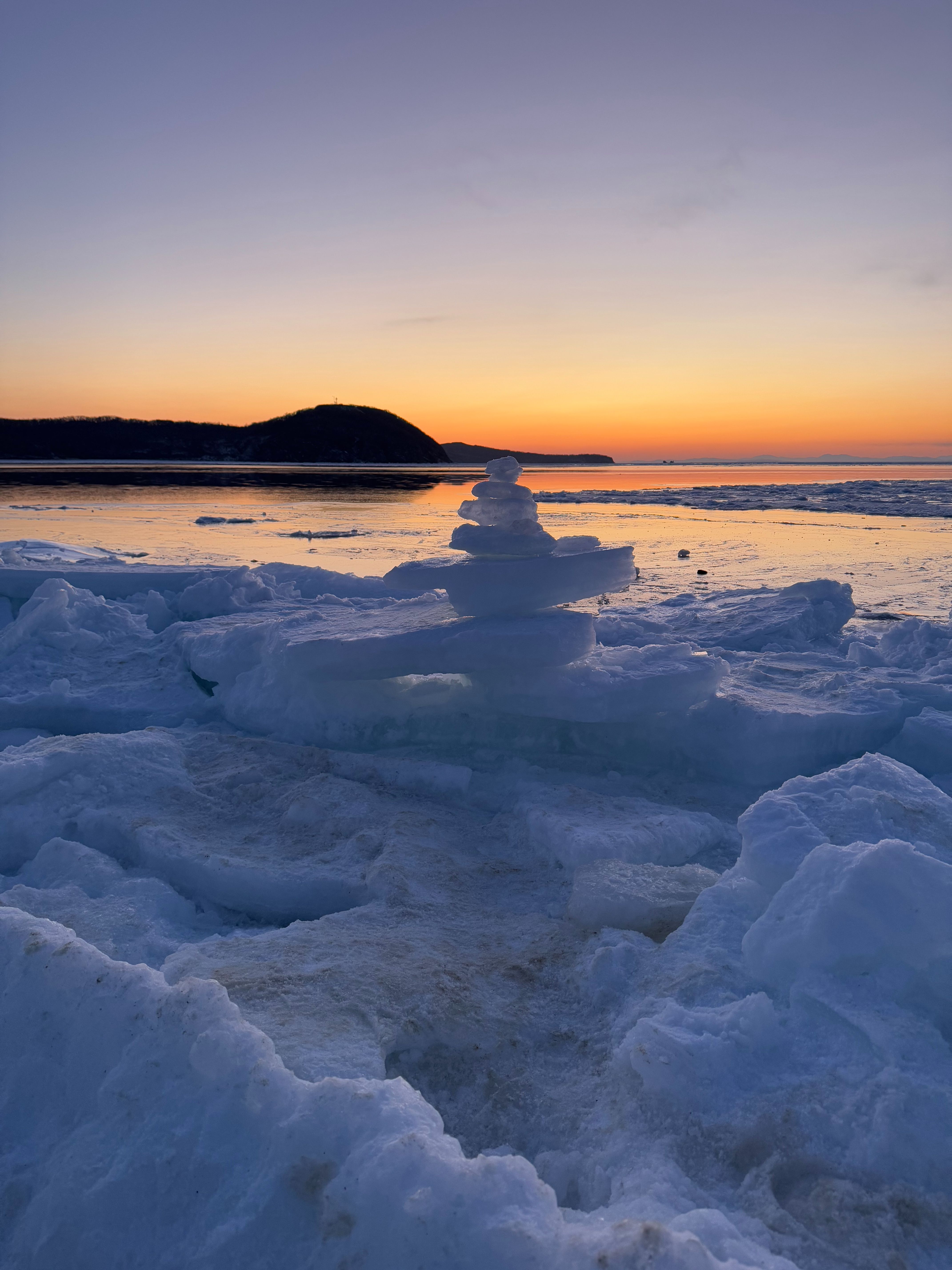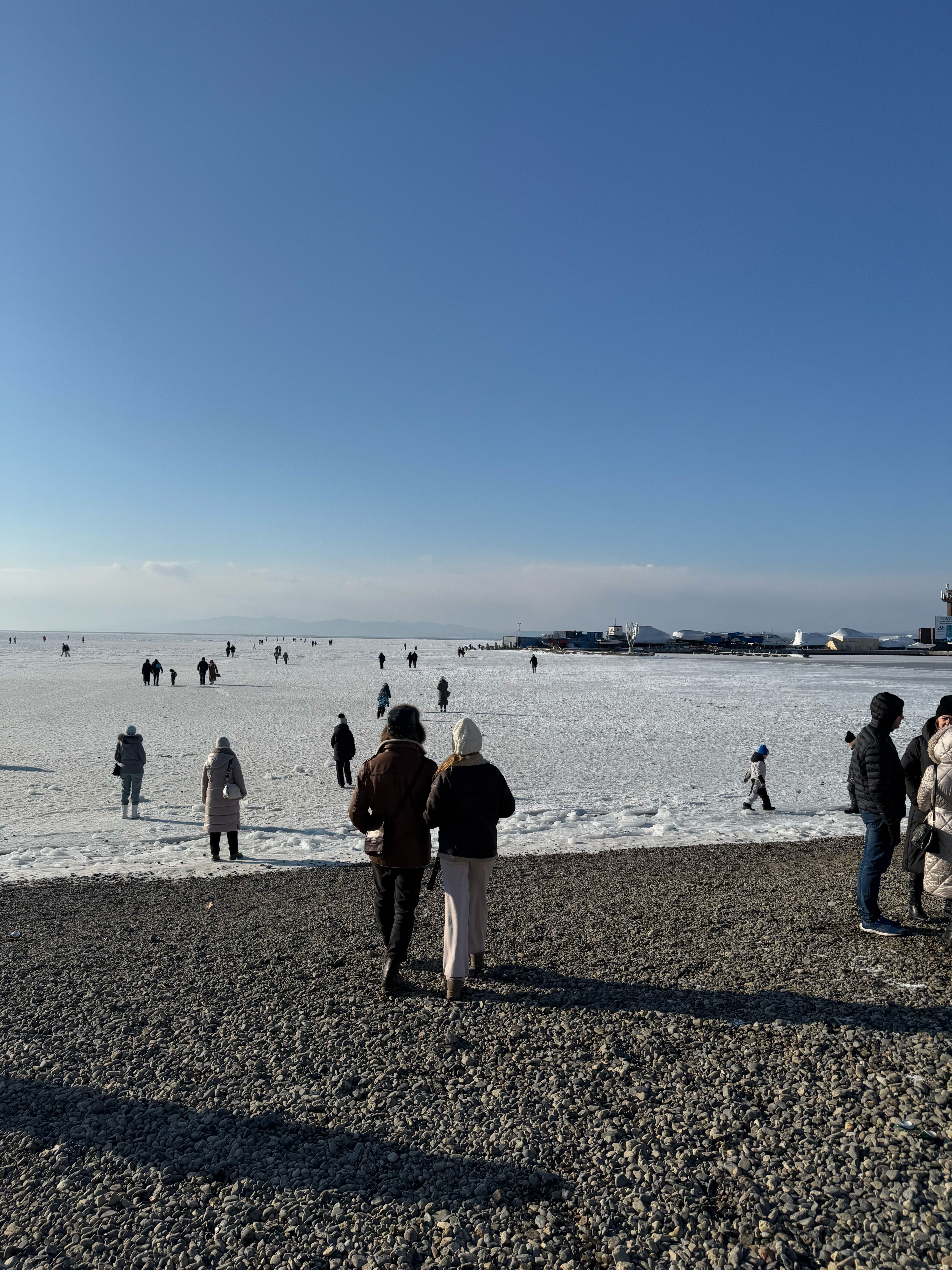 托卡列夫灯塔是《七月与安生》的取景地,来海参崴必打卡的地方。我到的时候天已经有点暗了,冬天的雾气裹着灯塔的暖黄色灯光,照在岸边的冰面上,又冷又有氛围感。沿着砂石路往灯塔走,脚下的冰特别结实,蹦跶几下都没事。偶尔还能看到几只海豹在冰缝里躲着,隐隐约约的。风刮在脸上跟小刀子似的,带着点海冰的咸味儿,清清爽爽的,但孤独感一下子就上来了。