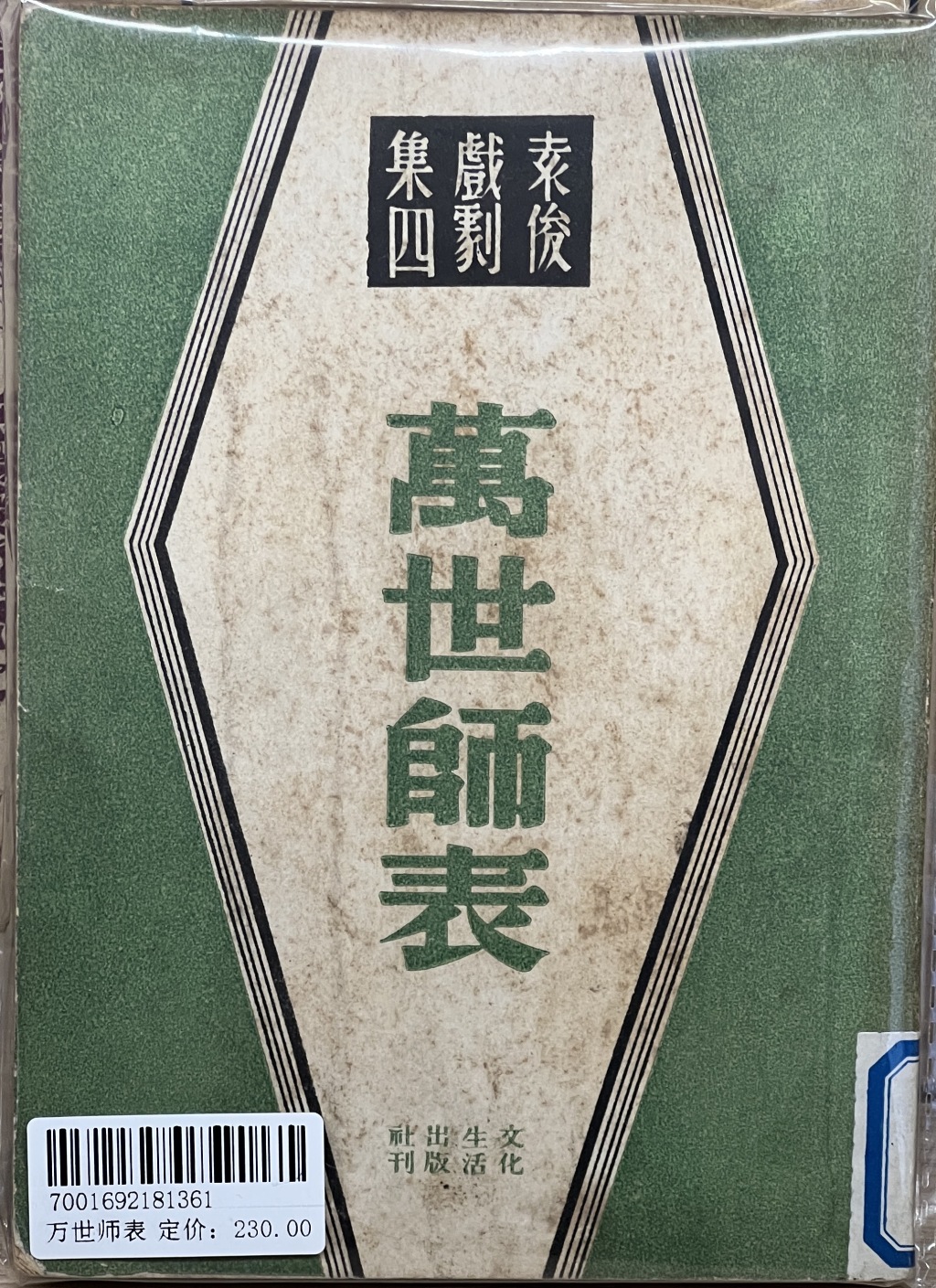 《万世师表》为民国铅印本,作者袁俊(张骏祥),属“袁俊戏剧集第四种”,是一部四幕七场经典话剧。剧本以五四至抗战时期为时代背景,塑造了坚守教育理想、清贫自守的大学教授林桐这一经典形象。