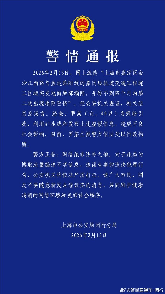 2月13日晚,@警民直通车-闵行发布警情通报:2026年2月13日,网上流传“上海市嘉定区金沙江西路与金运路附近的嘉闵线轨道交通工程施工区域突发地面局部塌陷,并称不到四个月内第二次出现塌陷险情”。经公安机关查证,相关信息系谣言。经查,罗某(女,49岁)为吸粉引流,利用AI生成和发布上述虚假信息,造成不良社会影响。目前,罗某已被警方依法处以行政拘留。