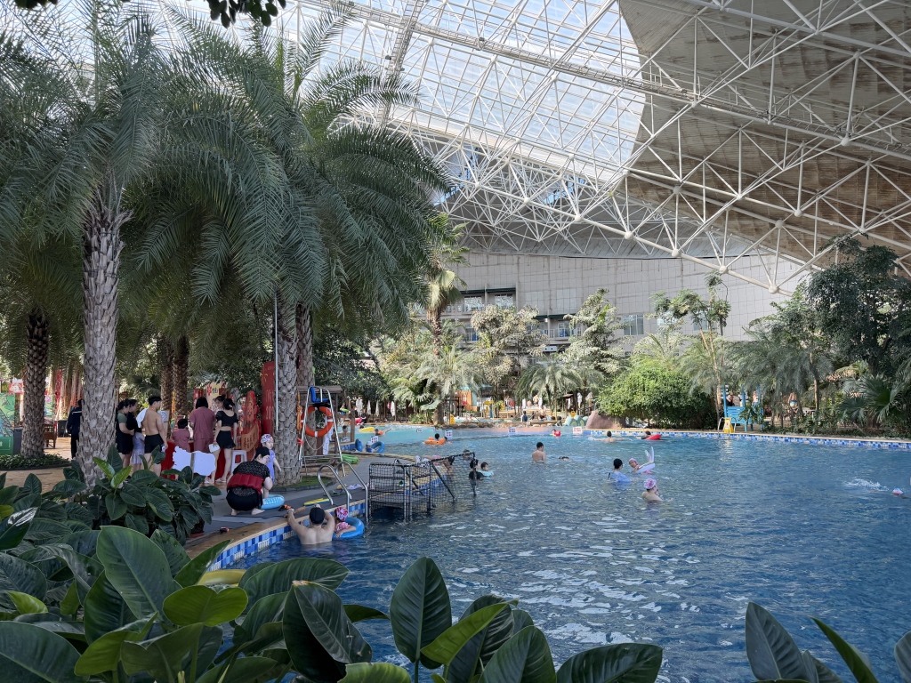 在白天的冰雪世界里,老君顶冰雪王国与紫云山、天女小镇等滑雪场以大众冰雪挑战赛等主题赛事汇聚人气。而这些冰雪场地与渔岛温泉之间,仅需一个多小时车程,这种布局为游客打造了一条完美的“冰雪+温泉”体验动线。在渔岛景区,室外是冻海景观,游客们在这里喂着海鸥,享受冬季海边的快乐。室内温泉馆内是一片“丛林仙境”,仿佛瞬间来到热带雨林,与室外形成鲜明的反差。