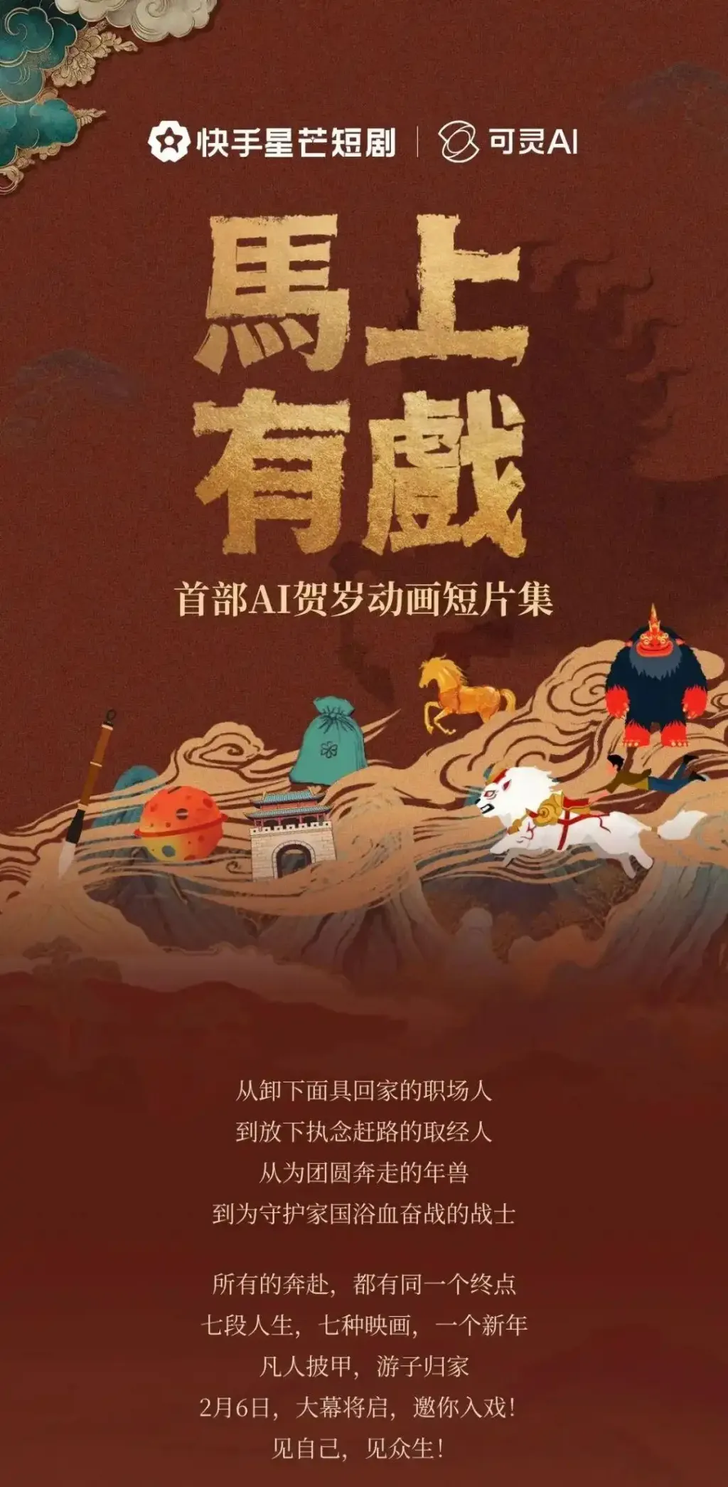 快手星芒以18部精品短剧组成片单,联合可灵AI推出首部AI贺岁动画短片集《马上有戏》,以“马”相关成语命名,深度贴合马年春节氛围;《撕婚》《春昼》等作品精准覆盖不同受众。优酷成立漫剧频道,腾讯视频2月2日启幕短剧节,同步推出漫剧独立App“火龙漫剧”;爱奇艺聚焦微剧场,《新英雄本色》站内热度破4000,搭配演员直播接力深耕用户。