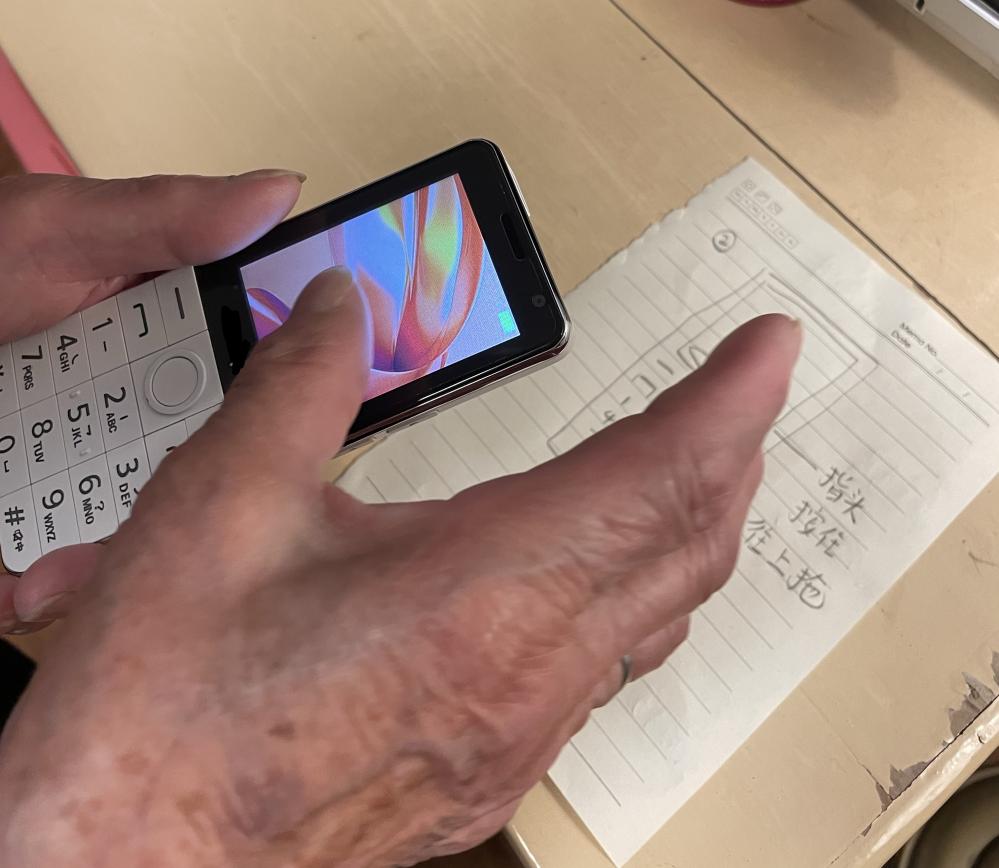 草草作图后,我仍将重心放在按键解锁上,她记性不比从前,学得依然吃力。在我让她试着感受用手指滑动屏幕解锁后,她惊喜地望向我,睁大眼睛,直夸这个方法好,之后便是不间断地熄屏、点亮、滑动解锁……在我离开前,她一直在练习。