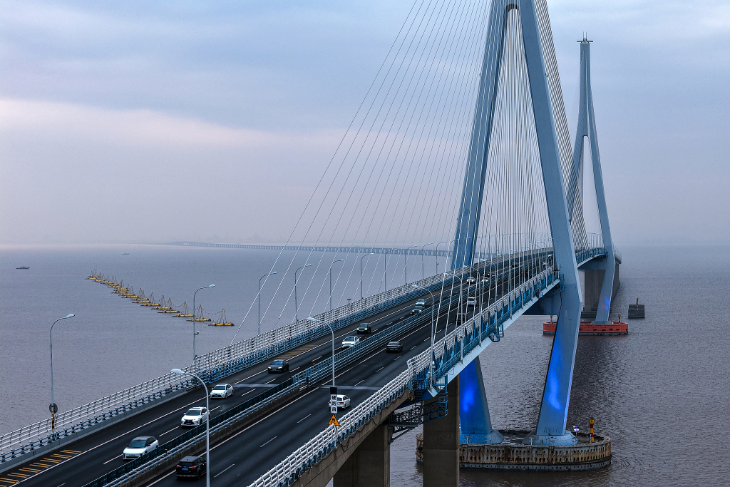 2026年2月15日傍晚,浙江舟山,G9211甬舟高速舟山跨海大桥车流平稳。视觉中国 图