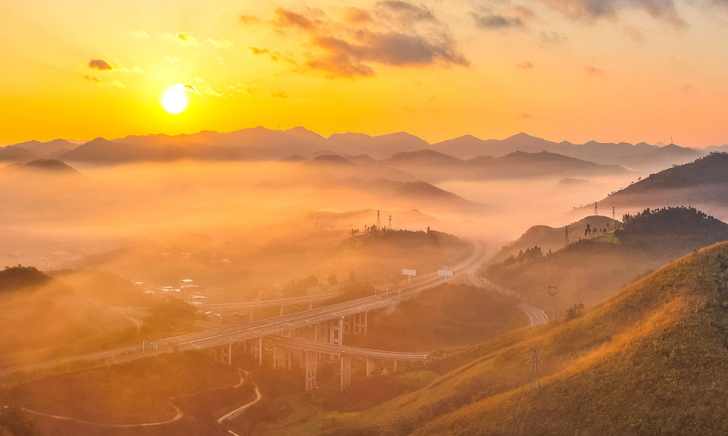 2026年2月15日,贵州望谟,朝阳穿透晨霭,将金色光芒铺满街巷与蜿蜒的环城高速,为团圆佳节添上一抹温暖底色。视觉中国 图