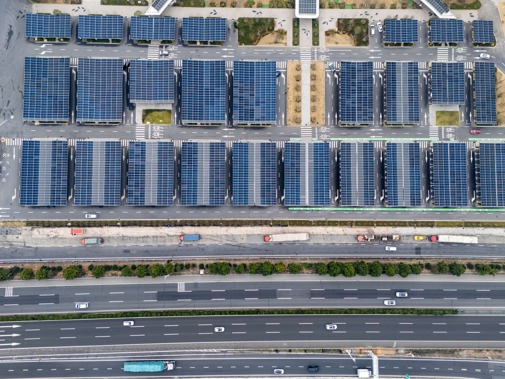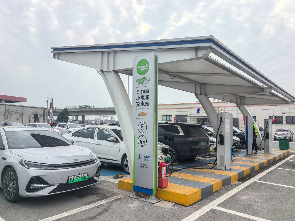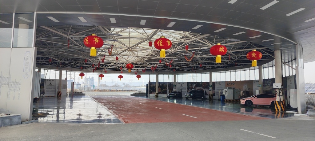 春运路上,在甘肃接驾嘴近零碳服务区,新能源车辆通过“光储充超级充电站”实现20分钟快速补能。新华社记者李杰 摄