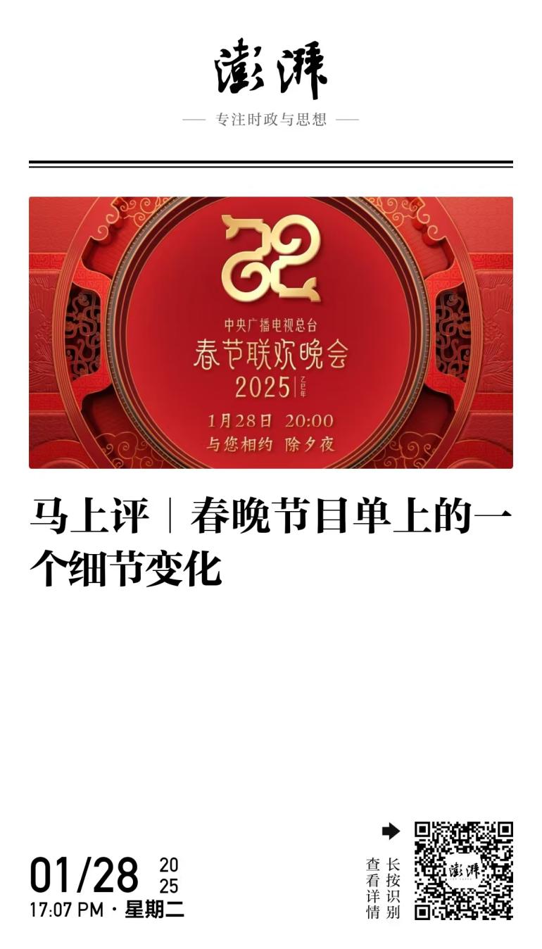 文章写道,“一个细节的变化就是在今年(2025年)的春晚节目单上,来自港澳台的表演者不再和往年惯例一样,特别标注中国香港、中国澳门和中国台湾。这是一个令人欣喜的变化:同为中国人,自然不用分彼此。”