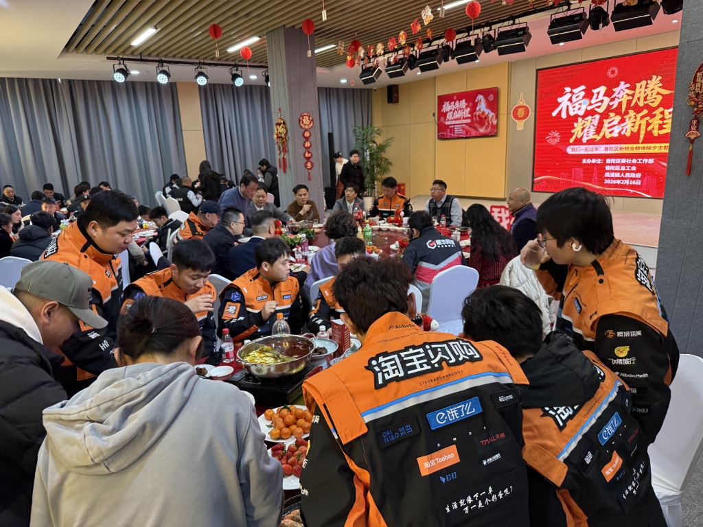 2月16日除夕这天,上海普陀区新杨居高司机之家党群服务站内,写福字、贴春联、包水饺、拍合影……一系列贺新春活动排得满满当当。接近中午,一场新春演出活动开启,许亚羊与家人团团围坐在圆桌旁,在年味十足的歌舞声中、在热气腾腾的饭菜里,感受着异乡的温暖。现场,同样被这份年味包围的,还有近50名外卖员、网约车司机、货车司机等新就业群体。