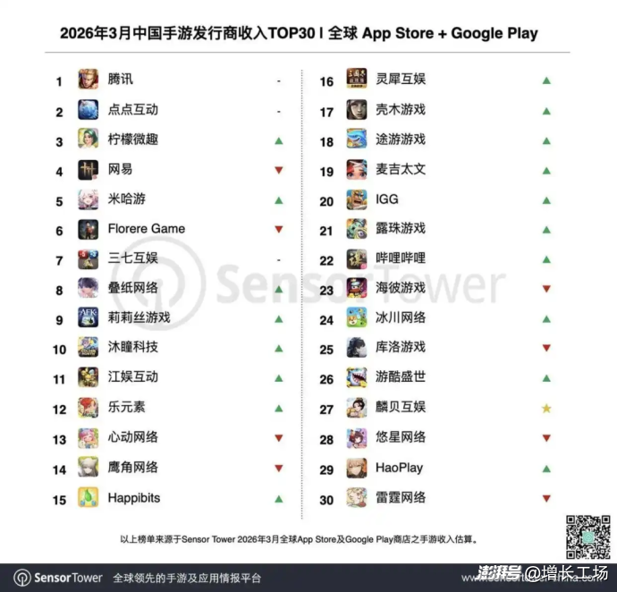 3月,三七互娱收入环比上涨28%,位列全球第7。最大功臣《Last Asylum: Plague》,凭借新颖题材和副玩法,本期收入暴涨近11倍,成为2026年全球化现象级力作。