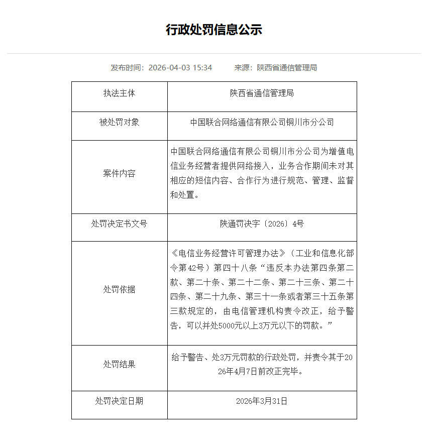 行政处罚信息(陕通罚决字〔2026〕4号)显示,中国联通陕西铜川分公司为增值电信业务经营者提供网络接入,业务合作期间未对其相应的短信内容、合作行为进行规范、管理、监督和处置。