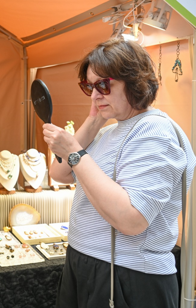 4月17日,上海静安寺商圈,一名外国游客在试戴耳环。澎湃新闻记者朱伟辉 图