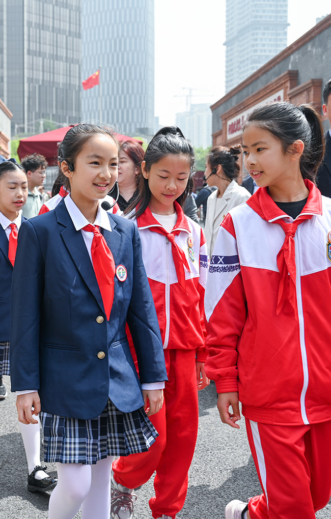 4月20日,上海市黄浦区卢湾一中心小学的“红喇叭小讲解员”在一大会址前讲解。澎湃新闻记者 朱伟辉 图