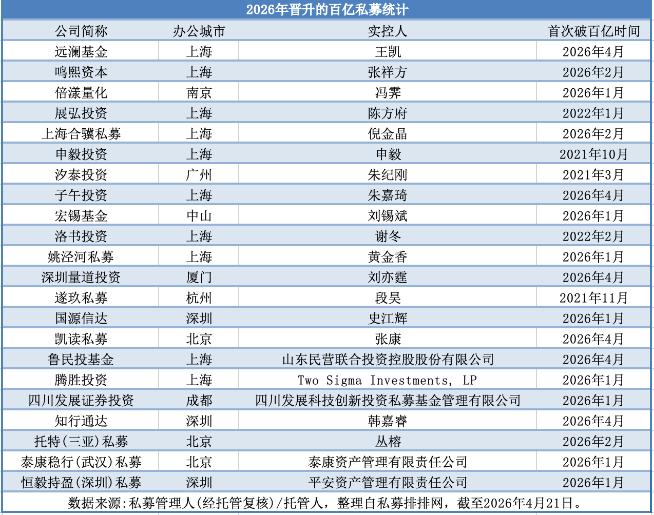 此外,今年以来也有4家私募暂时退出百亿行列,也就是说,百亿私募数量今年以来增长了18家。
