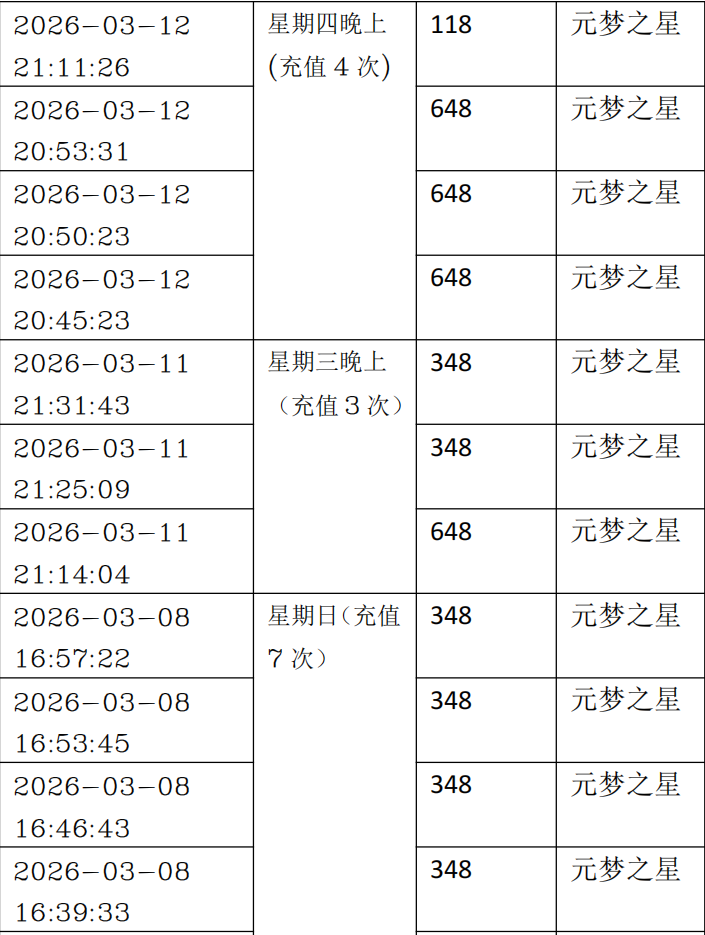 李先生提供的部分游戏充值记录显示,充值时间集中在工作日晚上和周末。