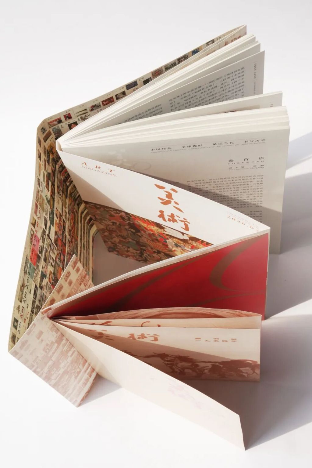 《美术》杂志是新中国创刊最早的美术专业期刊。第700期的《美术》杂志推出了纪念专刊,这本专刊的封面设计从过往700个封面中选出11个经典封面装订成册,护封展开是700期封面全貌,是一部微缩的新中国美术视觉史,读者也可以此回顾《美术》76年的精彩瞬间。700期主视觉以数字700为核心,搭配红、金、白经典配色,延续期刊的历史质感。专刊中设置“700期笔谈” 专栏,汇集三十余位学者的文章。