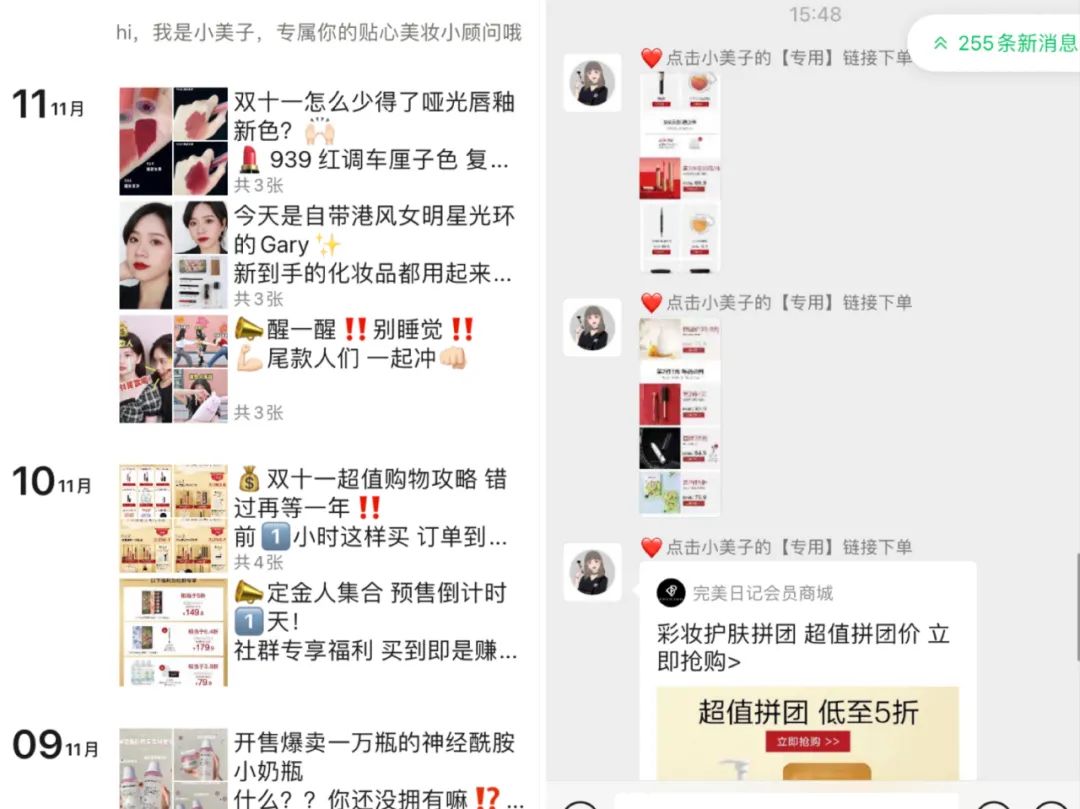 “我们班所有女生,几乎人手一个完美日记的微信群,朋友圈里活着好几个‘小完子’销售助理。”广东某学校大四学生告诉AI蓝媒汇:“大家也都忘了从哪加的,反正就是每个人都有。”