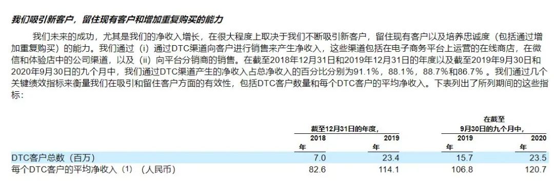 但完美日记现阶段的运营数字中,尚缺乏这些数字的增长。招股书公布的用户量和复购率均不容乐观。截至2020年前三季度,完美日记的DTC渠道用户数为2350万,而这项数字在2019年年底就已经达到2340万,九个月的周期内,变动比例十分有限。