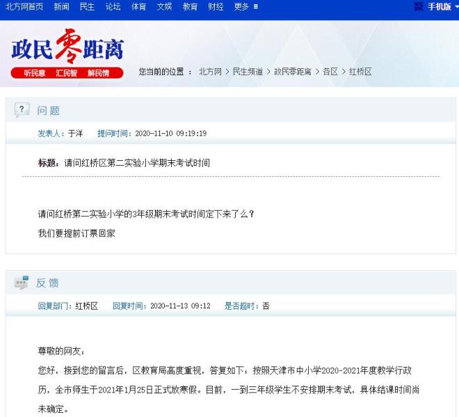 近日,有网友在北方网《政民零距离》栏目留言询问小学期末考试时间安排。对此,红桥区政府回复:按照天津市中小学2020-2021年度教学行政历,全市师生于2021年1月25日正式放寒假。目前,一到三年级学生不安排期末考试,具体结课时间尚未确定。
