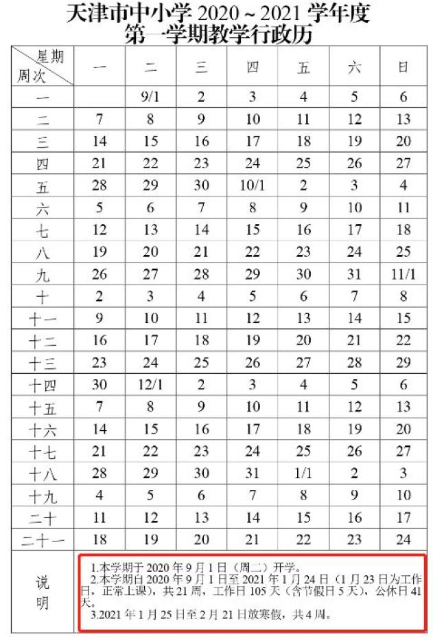第一学期2020年9月1日(周二)开学,2021年1月25日(农历腊月十三,周一)放寒假。共计21周,寒假4周。