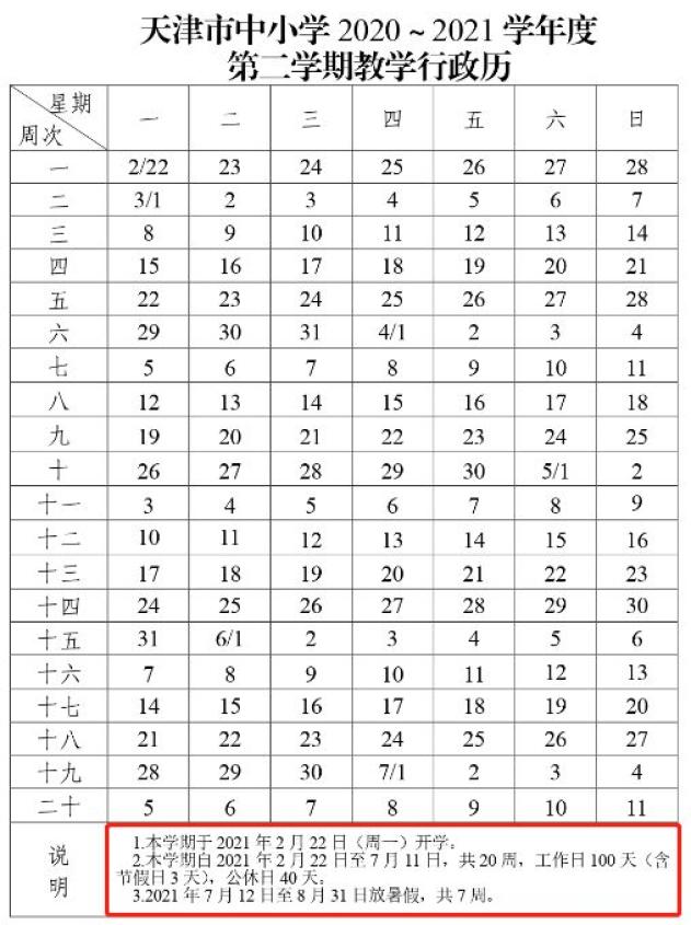 天津中小学教学行政历据天津市教委网站今年1月发布的中小学2020~2021学年度教学行政历: