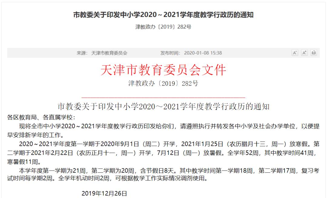 天津中小学寒假时间定了!共28天!