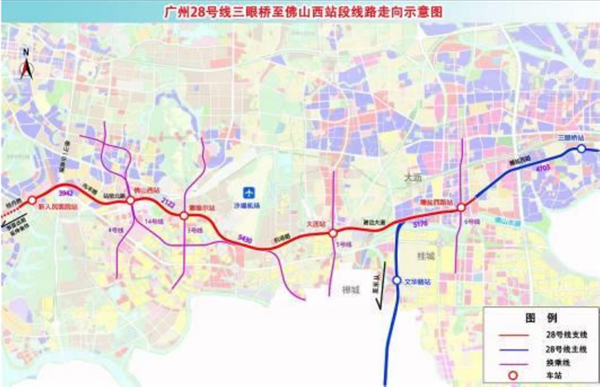 广州28号线西接佛山西站,东连广州新塘,是一条直接沟通佛山中心区和广州中心区的通道。28号线三眼桥至佛山西站段连接了佛山西站、佛山之眼以及南海区重点开发区域,对于进一步强化佛山西站和第二机场的枢纽集散能力、密切南海区与广州各片区的交流具有重要作用,将有力支撑佛山与广州区域一体化发展。