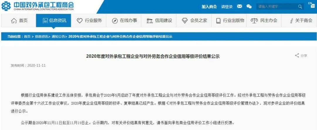 近日,中国对外承包工程商会对2020年度对外承包工程企业与对外劳务合作企业信用等级评价结果进行公示。公示期自2020年11月11日起至11月19日止。2020年度对外承包工程企业信用等级评价结果公示名单(复审)