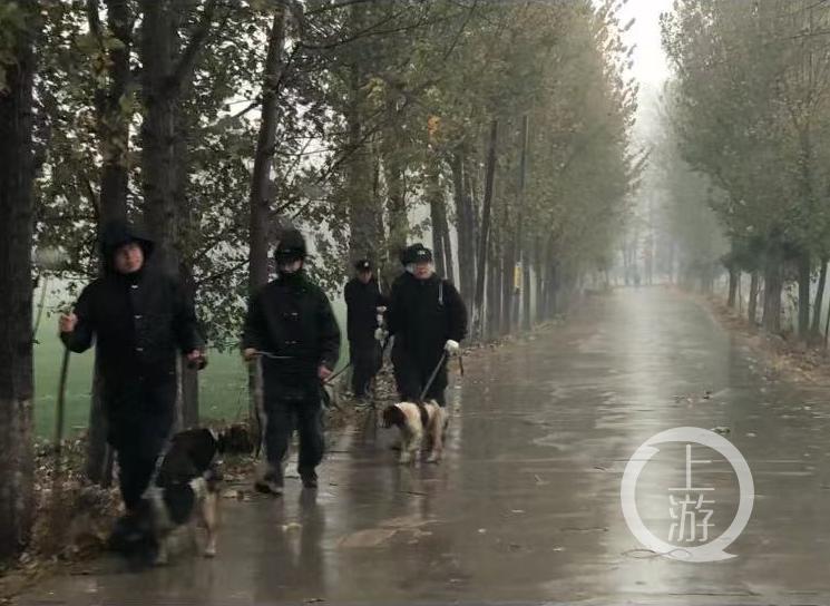 11月17日,民警牵着警犬在包南村搜捕。/记者 沈度
