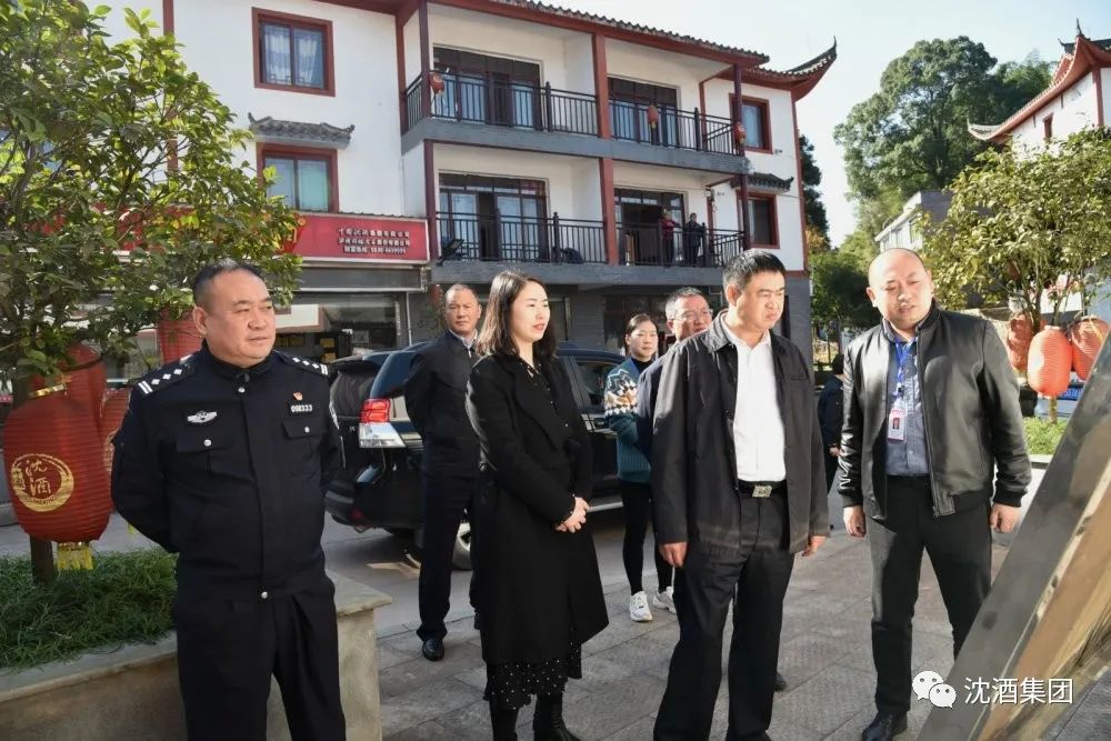 泸州市副市长、市公安局局长何绍明(前排右二)一行调研中国沈酒庄景区内扶贫+旅游三产融合白酒仿古一条街。